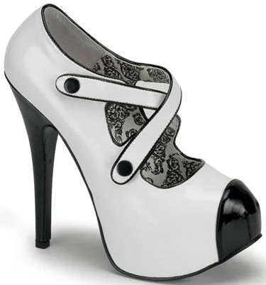 5 3/4″ Heel Pump, White Polyurethane & Black Patent with Black Piping, 2 Criss Cross Velcro Button Detail Straps and a 1 3/4″ Concealed Platform (TEEZE-23)