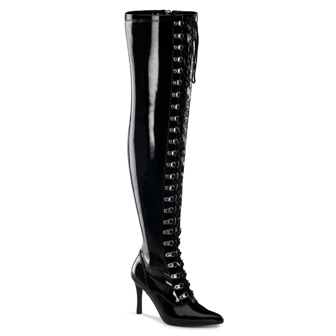 4″ (10.2cm) Heel, Wide Width / Shaft, Lace Up Thigh High Boot Full Inner Side Zipper (DOMINATRIX-3024X)