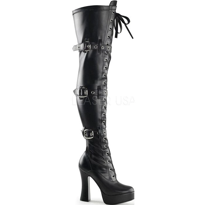 5″ (12.7cm) Stiletto Heel, 1 1/2″ (3.8cm) Platform Front Lace-Up Stretch Thigh High Boot with Grommetted Straps & Belt Buckles Detailing, Full-Length Inside Zip Closure (ELECTRA-3028)