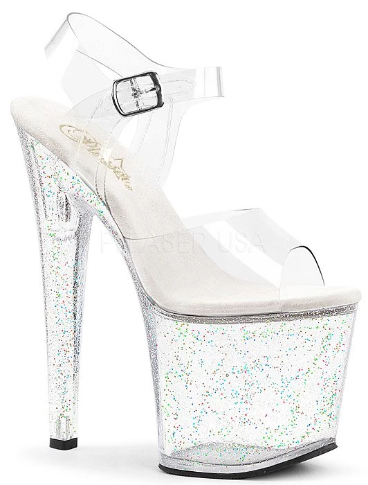 7 1/2″ (19.1cm) Heel, 3 1/2″ (8.9cm) Platform Ankle Strap Sandal Featuring Mini Iridescent Glitter on Entire Bottom (TABOO-708MG)
