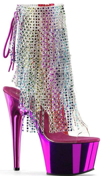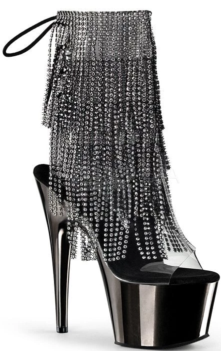 7″ (17.8cm) Stiletto Heel, 2 3/4″ (7cm) Chrome Plated Platform Open Toe/Stiletto Heel Back Lace-Up Ankle Boot Featuring 4-Layer Chrome Plated, Simulated Rhinestone Fringe, Inside Zip Closure (ADORE-1017RSF)